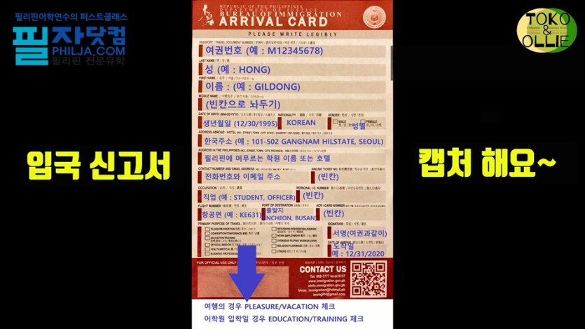 대부분 질문없이 통과하는 경우가 많지만, 간혹 필리핀 입국사유를 물어보는 경우가 많습니다.