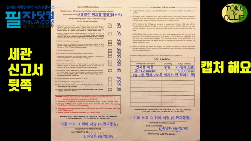기내에서 작성한 세관신고서를 제출하면 됩니다. 필리핀은 세관검사가 까다로운 국가중에 하나입니다.