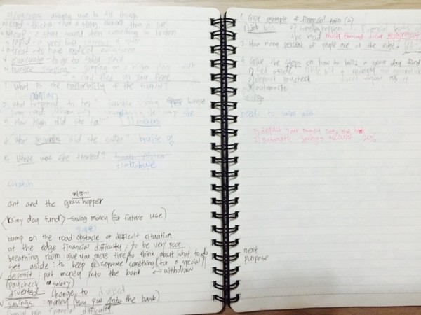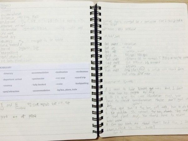 서바이벌 클래스도 마찬가지로 그 주의 주제를 가지고 진행이 되요. 위의 필기는 왼쪽이 주제와 관련한 관련 보카들이구요.