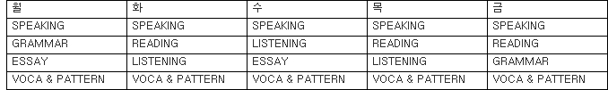 위 시간표대로 일주일에 두번정도는 일기 & 에세이를 쓰면서 Writing 감각을 유지시킨다