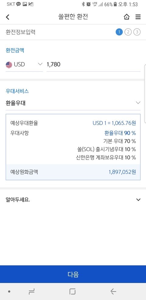 저는 신한은행 쏠(구 써니뱅크)를 사용하여 환전을 합니다. 우대율이 무려 90프로!! 고시환율과 비슷한 수준으로 환전을 할 수 있다는