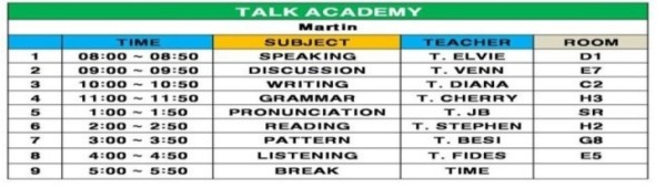 수업은 아침 8시부터 시작하여 오후 6시까지가 정규수업입니다. 당연히 수업에는 Listening, Grammar 등 포함되어 있구요.