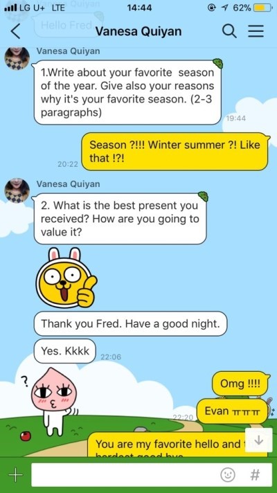 아파서 수업을 못나왔었는데 나의 티쳐가 날도 어김없이 카톡으로 숙제를 줍니다 ...ㅋㅋㅋ