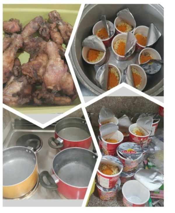 그때 7교시티쳐가 손수 닭을 요리하고 밥도 준비하고, 제가 라면을 준비하고, 다른 티쳐들이 음료를