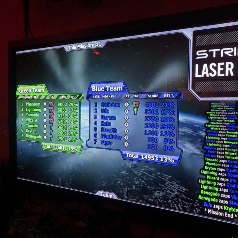 팀을 둘로 놔눠 어두운 공간에서 서바이벌 게임을 하는 건데