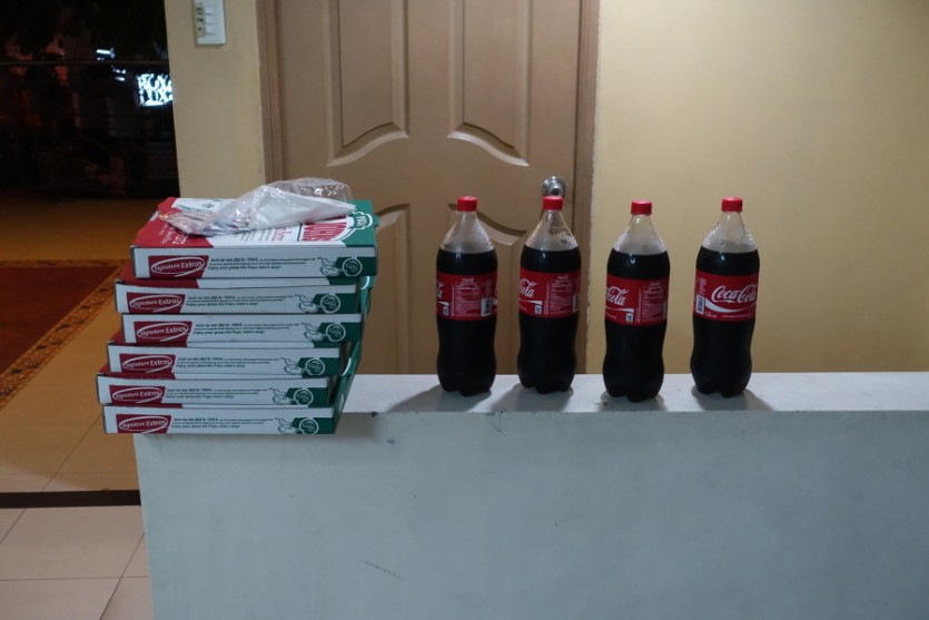 착하게 기다리고 있는 피자와 콜라들. 이제 얼마 남지 않았습니다. 곧 있으면 신나게 피자를 먹을 일만 남았습니다.
